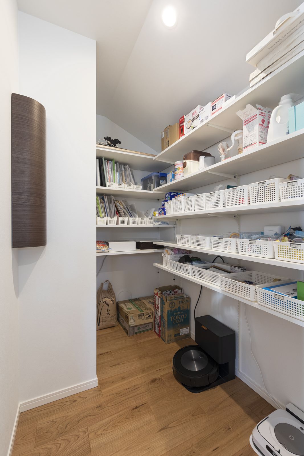 キッチンの奥には大型のパントリーも。食料品や飲料のストックのほか、日用品や取扱説明書などの書類も収納しやすいよう可動式の棚を設置しています。お掃除ロボットの基地にも利用されています。