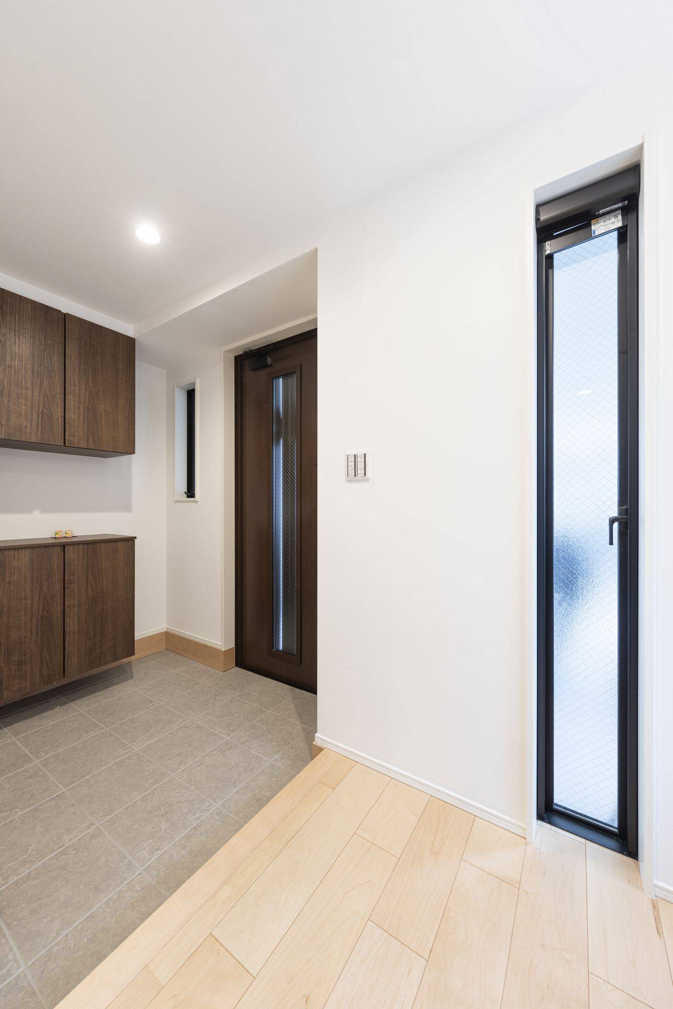 さらに、玄関には縦長のスリット窓を設け、自然光がやさしく差し込む設計に。日中でも照明いらずの明るさで、空間全体がパッと華やいだ印象に仕上がっています。暗くなりがちな玄関に、光と開放感を取り込むさりげない工夫です。